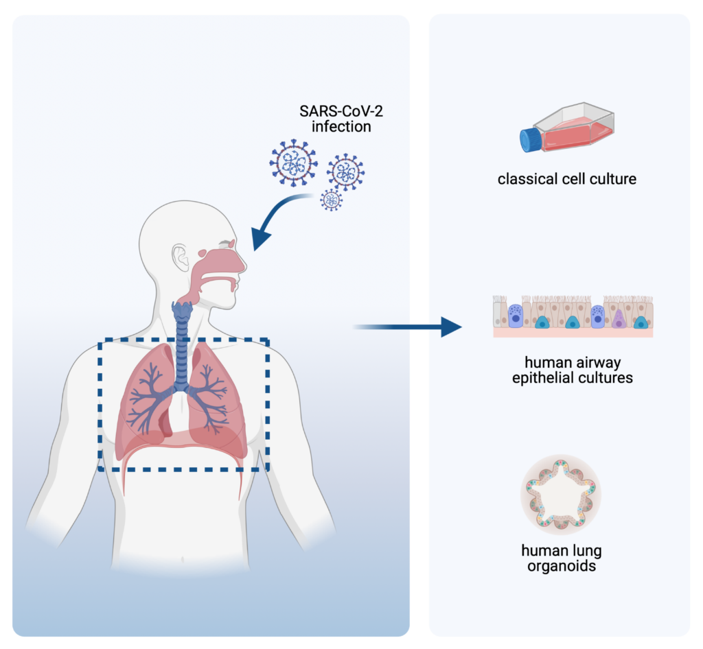 Zur Untersuchung der viralen Infektion in vitro sind authentische Zellkulturmodelle unerlässlich. Den „Goldstandard“ für die Untersuchung von respiratorischen Erregern, wie SARS-CoV-2, stellen aktuell 2-dimensionelle Modelle da, die auf primären Atemwegsepithelzellen basieren, und molekulare und funktionelle Aspekte des menschlichen respiratorischen Epithels widerspiegeln. Die sogenannten „Airway Epithelial Cultures“ (AEC) werden in einer Luft-Flüssigkeit Interphase (ALI; air liquid interphase) angezüchtet und zeichnen sich durch eine hohe Ähnlichkeit zum Lungenepithel in vivo aus, inklusive der Anwesenheit verschiedener Zelltypen wie Flimmerzellen, Sekretionszellen und Basalzellen in „pseudostratifizierten“ Zellschichten. Neben Atemwegsepithelzellen, stellen organ-ähnliche 3-dimensionale Gewebekulturen, sogenannte Organoide, ein alternatives Zellkultursystem dar. Organoide sind ein verlässliches Modellsystem, das viele Limitierungen von konventionellen Zellkultursystemen und Tierversuchen überwindet. Sie sind dazu geeignet virale Erkrankungen zu untersuchen, Pathogenese zu verstehen und potentielle Medikamente zu testen. Unterschiedliche Lungenorganoidtypen können aus verschiedenen Zelltypen wie pluripotenten oder embryonalen Stammzellen und Primärzellen wie humane bronchiale Epithelzellen differenziert werden und bieten damit eine Vielzahl an Möglichkeiten zur individuellen Adressierung unterschiedlicher Forschungsfragen. Wir nutzen in unserer Arbeitsgruppe eine Vielzahl zelluläre Systeme (Heinen et al., 2021), neben 1-Dimmensionalen Tumor Zellkuturen auch 2D Atemwegsepithelzellen und 3D Lungen Organoide um die Coronavirus Infektion zu untersuchen und Wirtsfaktoren zu identifizieren, die eine Virus Infektion beeinflussen können.